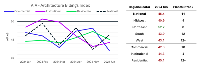 Most regions and sectors reported billings growth throughout most of 2021 and 2022, followed by little change in the first half of 2023. However, since August 2023 national architecture billings have continuously fallen each month, reaching a recent low of 42.4 in May. The last time the national index fell to this level was in 2020 during the pandemic.