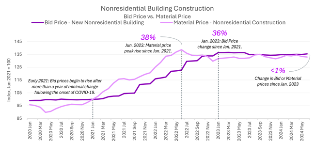 National bid prices for nonresidential building construction have remained nearly flat since January 2023. In fact, the national price level decreased by 0.67% between January 2023 and June 2024. This recent period of stability follows a time of historically rapid escalation beginning in mid-2021 and lasting through 2022. Bid price escalation over the last six months is approximately 0.8%.