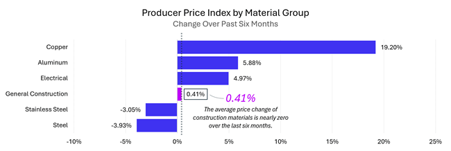 Despite little average change, prices for certain material groups have been quite volatile. Copper, aluminum and electrical groups have reported the most change of 19.20%, 5.88% and 4.97% over the last six months, respectively. On the other end of the spectrum, steel and stainless steel have reported price reductions over the same period.
