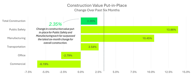 Over the past six months, monthly construction investment has grown substantially for the institutional, infrastructure and manufacturing sectors. Commercial investment fell by a substantial margin during the same period, continuing a prolonged period of softening.