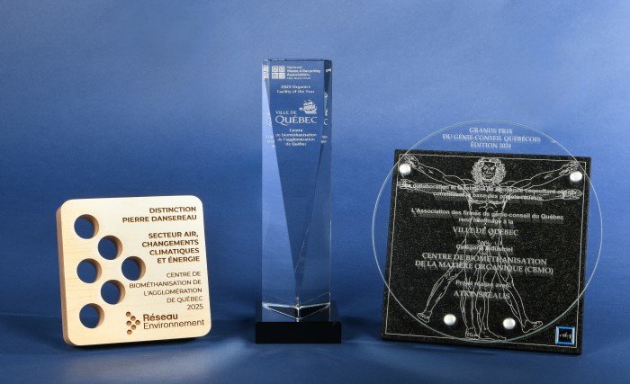 - Award of Excellence in the Industrial category of the Quebec Consulting Engineering Grand Prix from the Association des firmes de génie-conseil du Québec for the organic matter recovery centre (part of the CBMO).