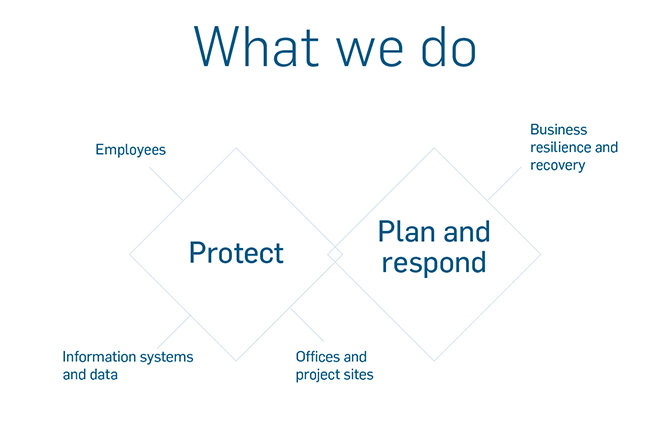 We’re committed to ensuring employees and stakeholders can focus on their work without interruption – from identifying and evaluating risks for facilities, offices, project sites and accommodations and providing the required security measures to safeguarding networks, computers, programs and data from threats, damages or unauthorized access.
