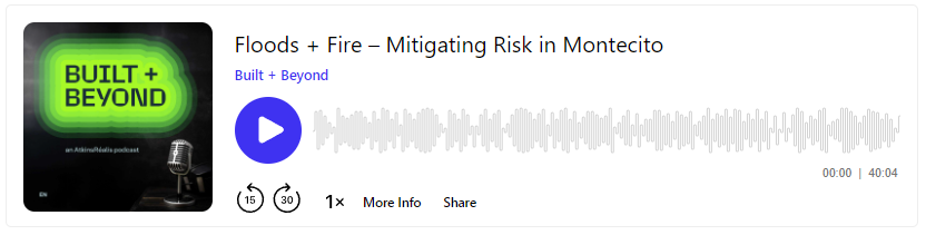 Listen to the Built + Beyond podcast Floods + Fire – Mitigating Risk in Montecito episode as our experts discuss the growing urgency for proactive measures in disaster preparedness, mitigation and climate resilience to safeguard lives and livelihoods.