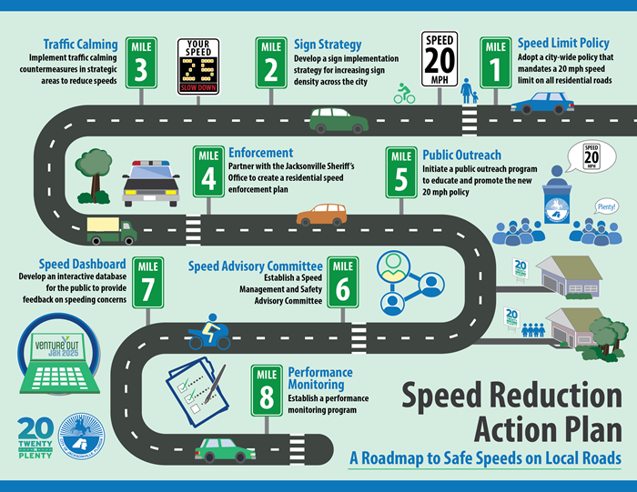 By decreasing speed limits in residential neighborhoods and other high-traffic areas, Jacksonville is taking a significant step toward reducing the likelihood of fatal or severe crashes. Our roadmap for speed limit reduction provides the city with an action plan that can help lead to fewer traffic crashes and improve the quality of life for residents by reducing disruptions to daily commutes and healthcare costs associated with these accidents.