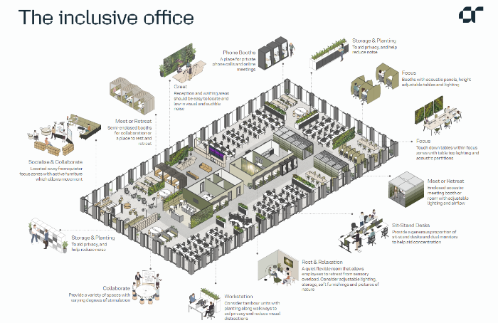 Taking a step back, we realised that offices are generally designed for a one-fits-all approach. Rows of desks, bright lights, the chatter of people in meetings, being too hot or too cold – it’s understandable why offices can be uncomfortable for some people.